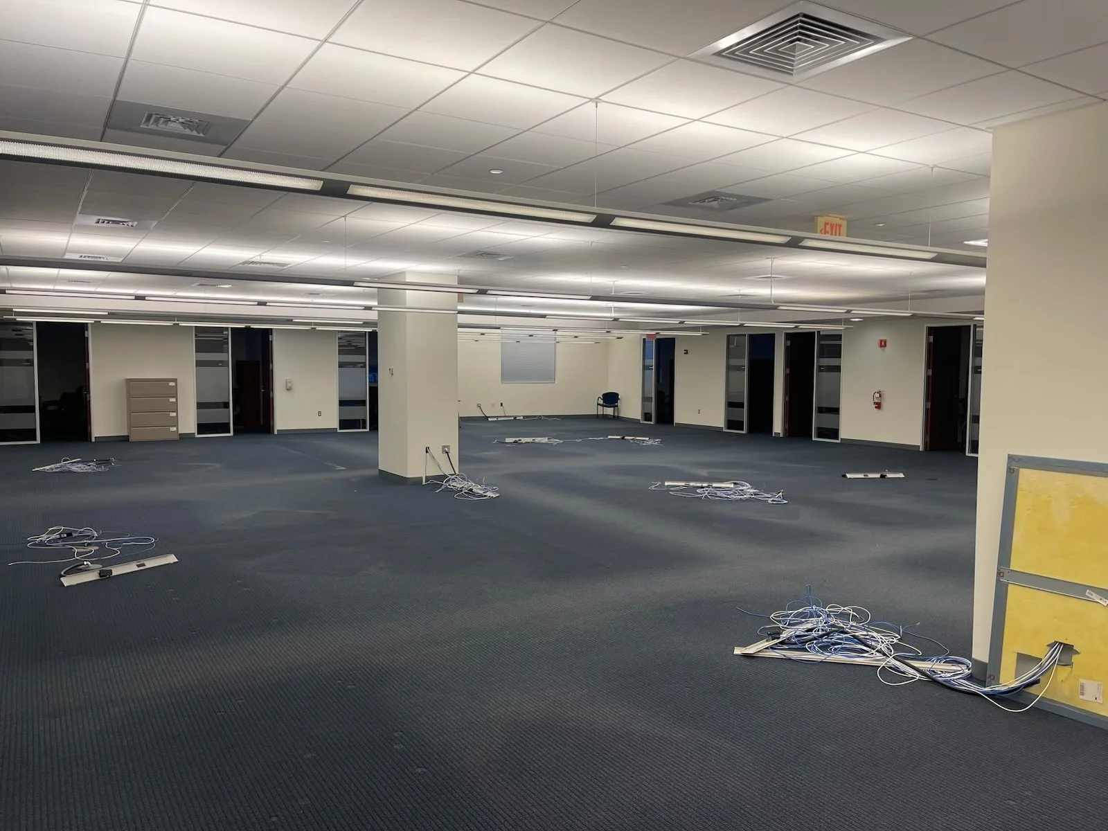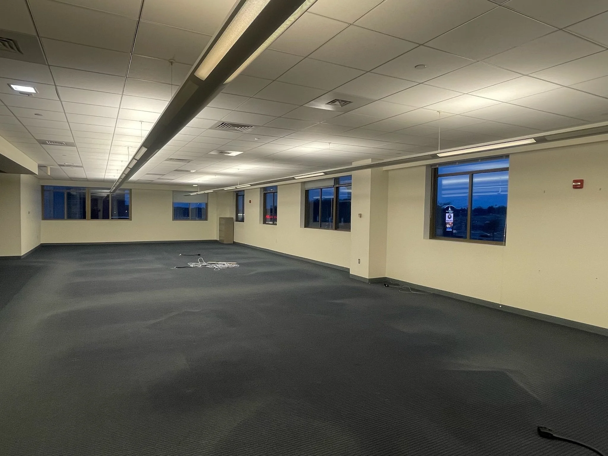 Wide-open interior, with perimeter, windowed private offices overlooking route one and gillette stadium